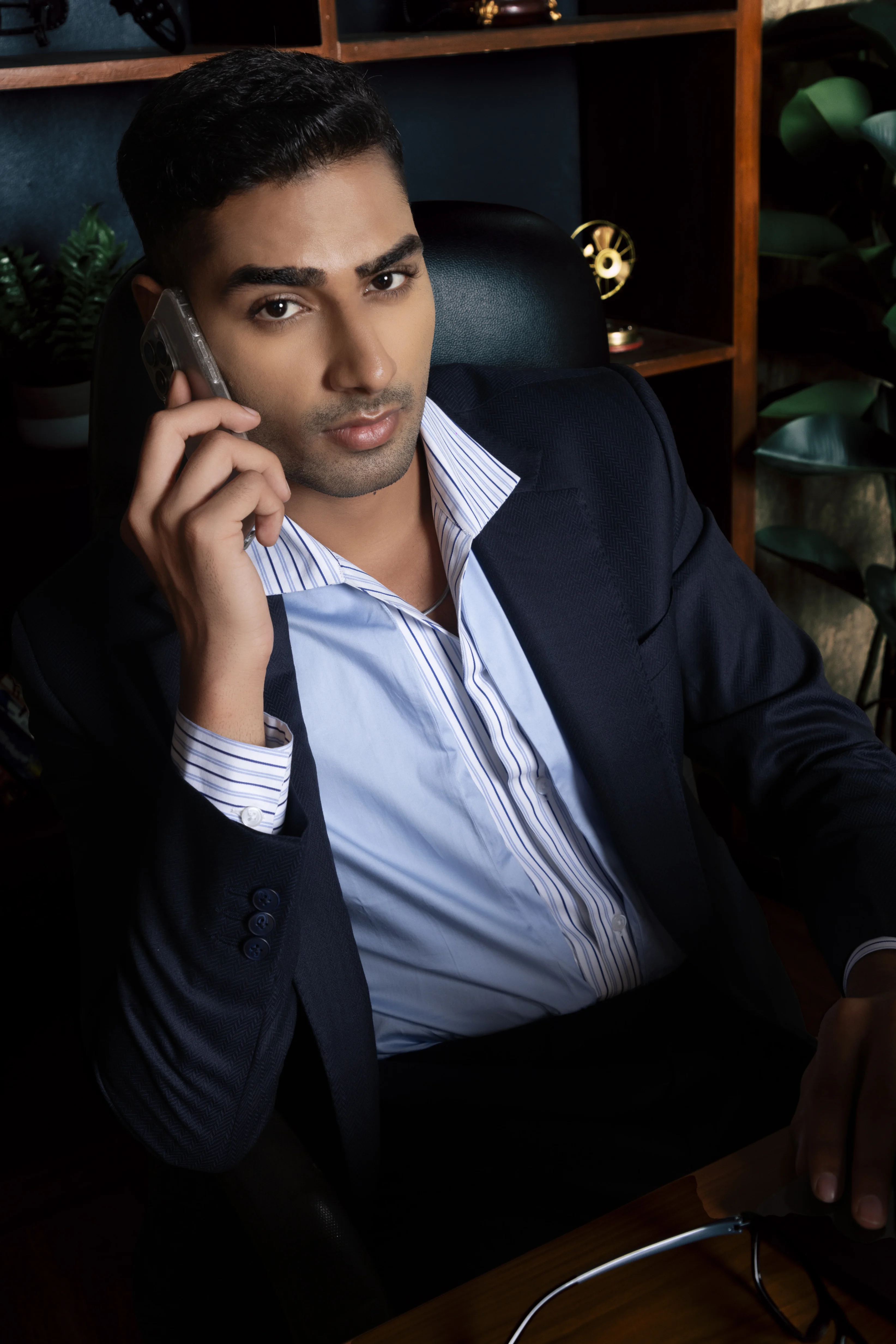 A timeless single-breasted navy suit in pure wool, paired with a striped azure shirt that softens its corporate precision. The look embodies versatility equally at home in boardrooms or twilight gatherings.
